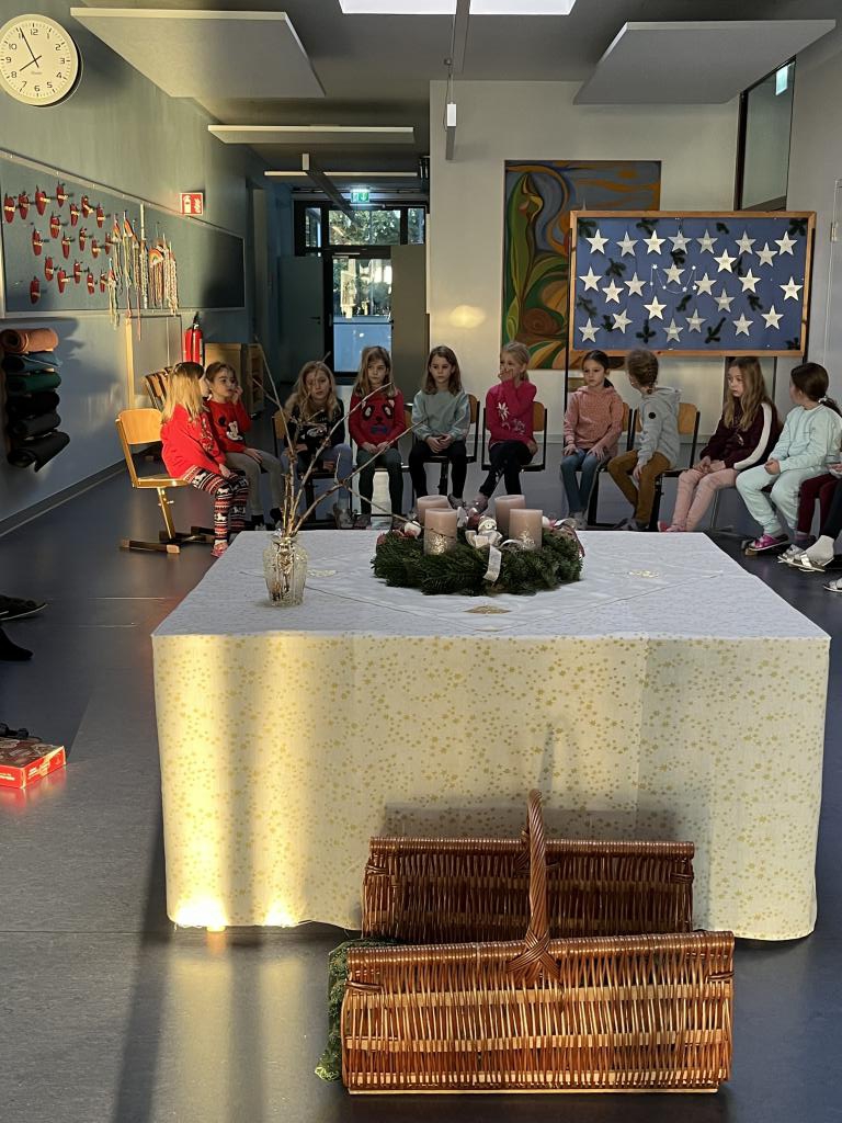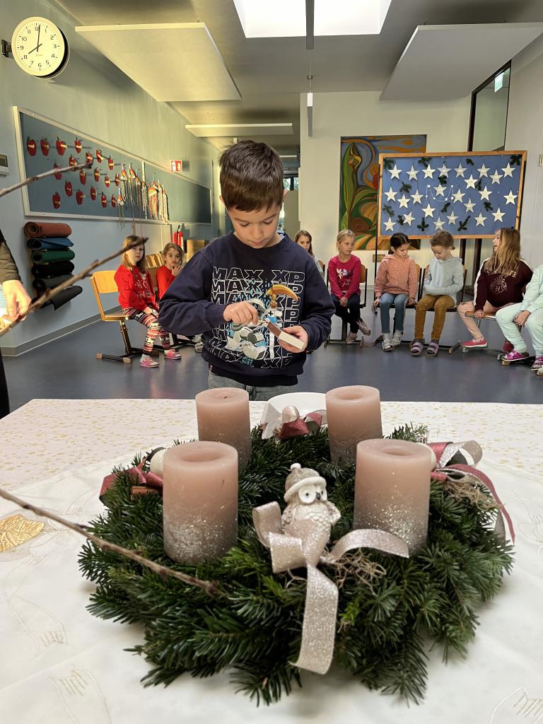 Ein zentrales Element des Morgenkreises in der Adventzeit ist das Anzünden der Kerzen auf dem Adventkranz. Die Kerze steht symbolisch für das Licht, das die Dunkelheit erhellt – nicht nur in unserer Aula, sondern auch in den Herzen der Kinder.